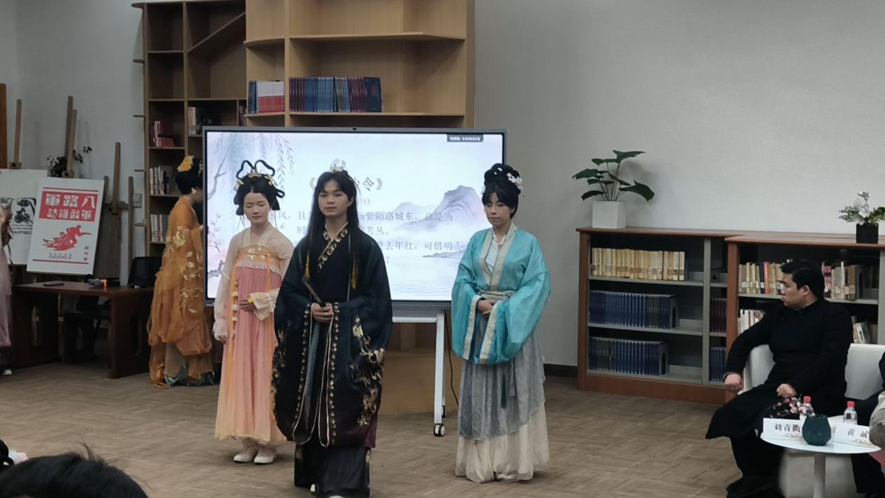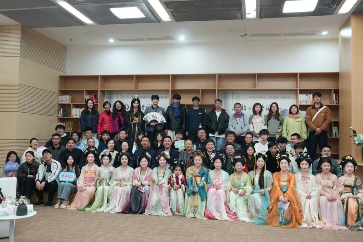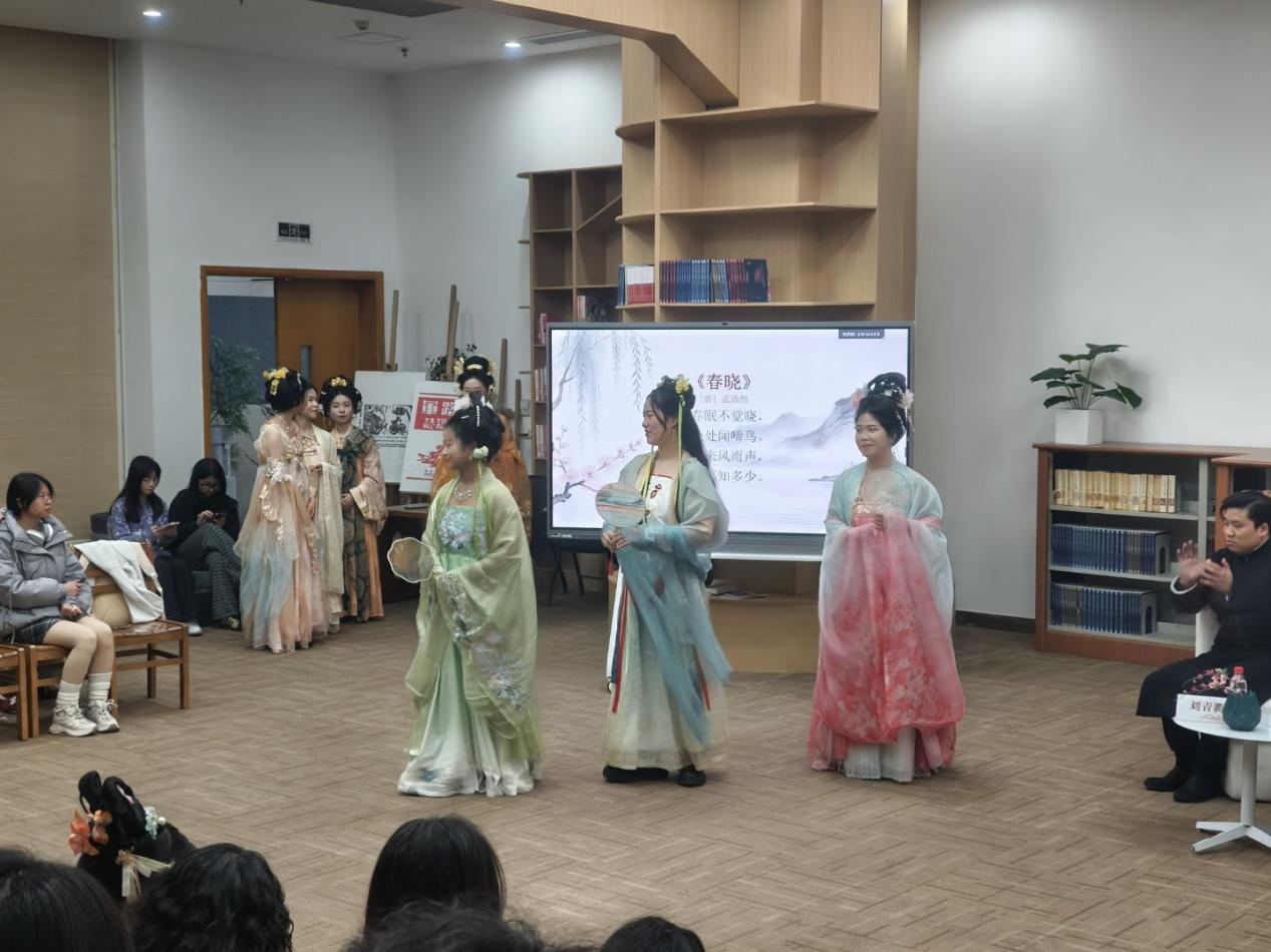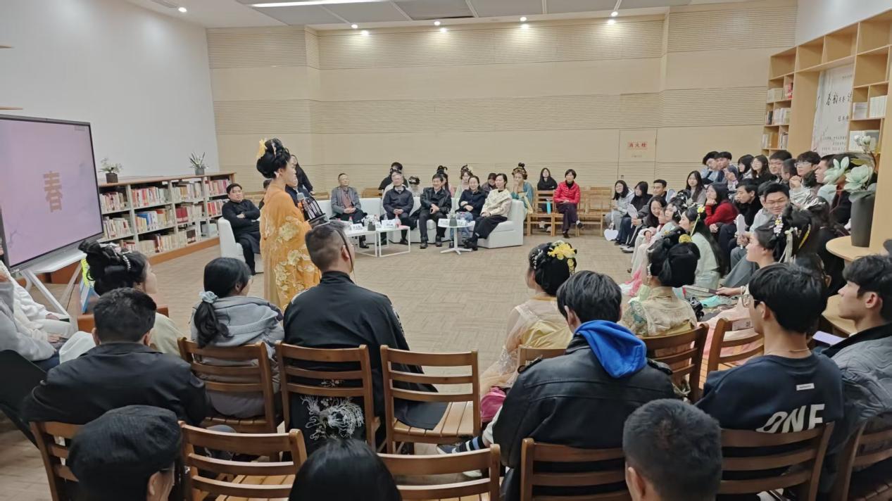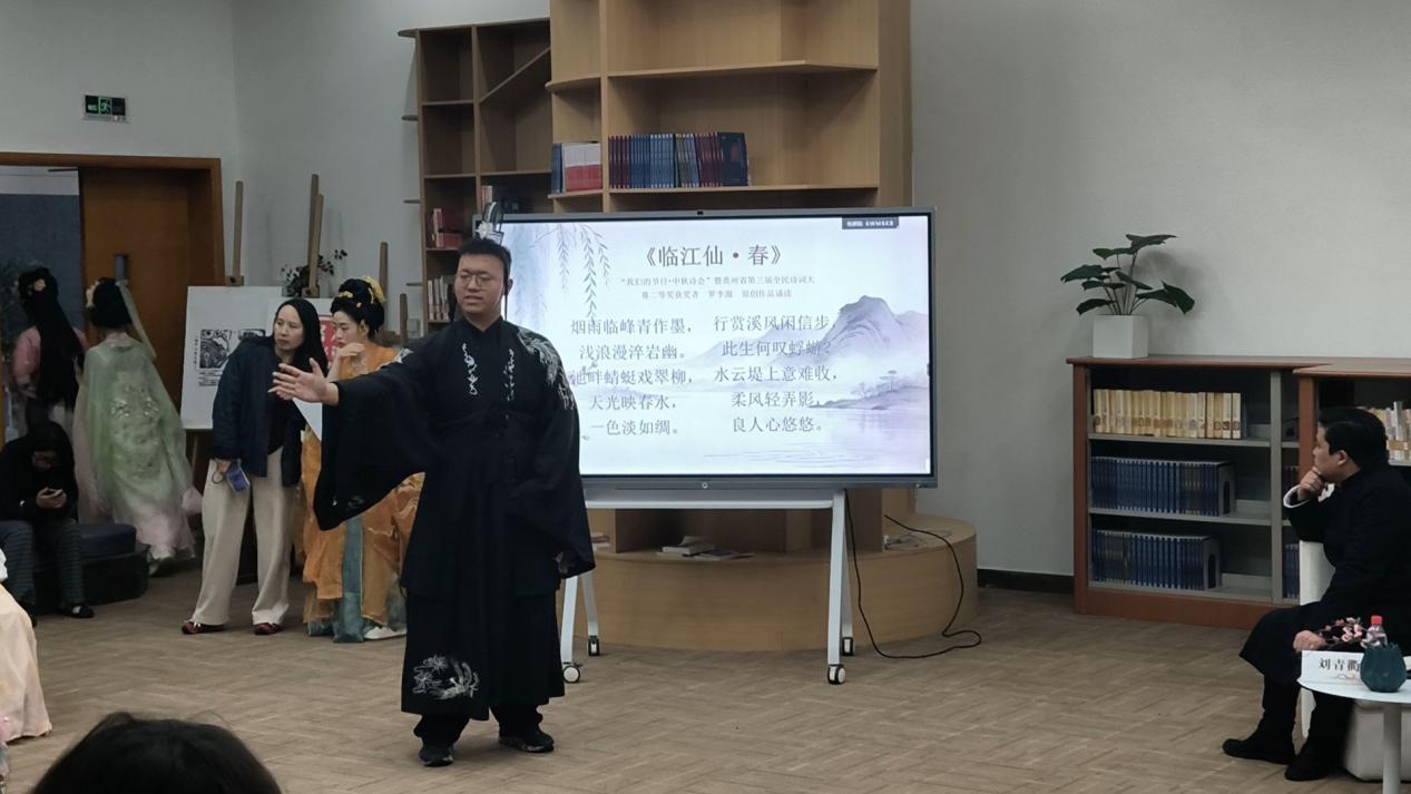 随后的“春韵诗诵・经典传承”环节中,十几位身着汉服的同学闪亮登场,他们以朗读与吟唱相结合的方式,依次演绎和展示了《如梦令》《春晓》《春夜喜雨》《忆江南》和《浪淘沙令》等经典春日诗词。活动还邀请到了由贵州大学图书馆选送并在贵州省第三届全民诗词大赛大学生组一等奖获得者许嘉霖、成人组二等奖获得者罗李源同学进行特别分享和展示。罗李源同学现场朗诵了其原创诗词作品《临江仙·春》,把家国情怀、青春感悟以及对诗词由衷的热爱都写进了诗句中。