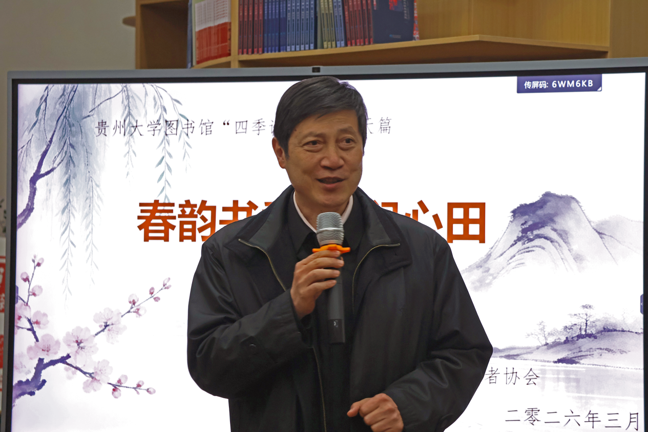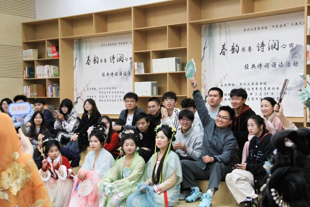 2026年3月29日,为传承中华优秀传统文化,营造浓郁校园阅读氛围,贯彻《全民阅读促进条例》推进书香社会建设要求和落实我馆“四季读书”系列活动工作安排,贵州大学图书馆在西校区图书馆学习书屋举办以春天“春韵书香诗润心田”为主题的经典诗词诵读活动,为全校师生打造了一场沉浸式的古典文化盛宴。